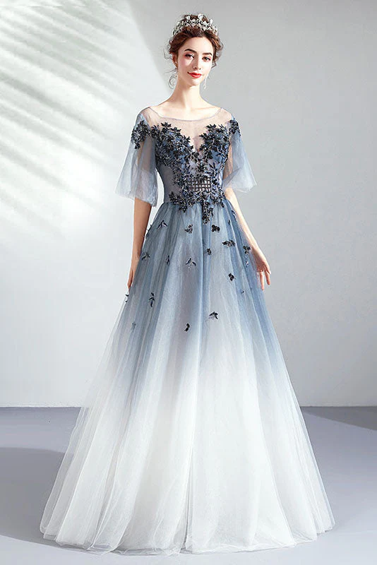 Ombre A Line Half Sleeves Tulle Round Neck Prom Dress OKQ75