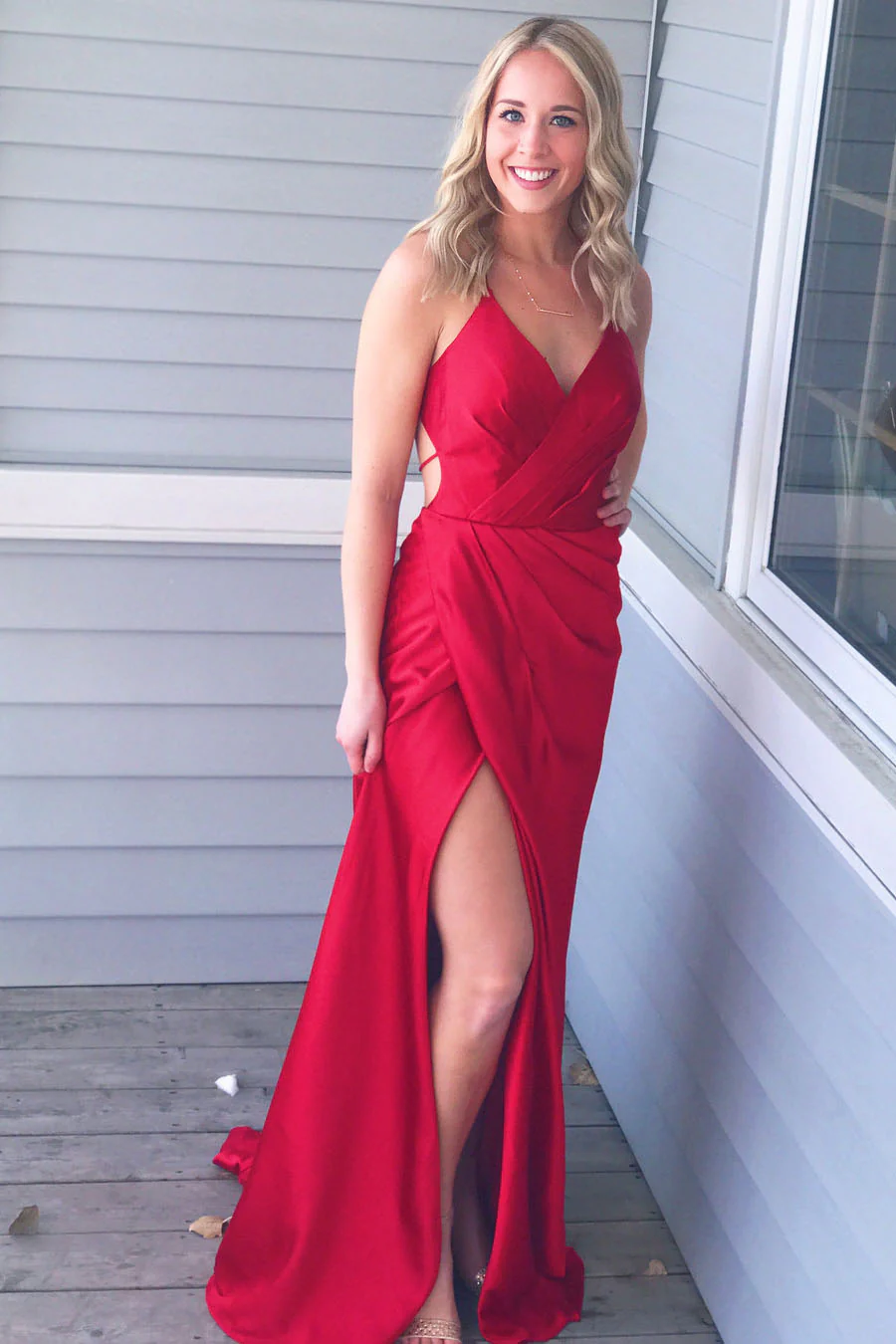 Simple Red V-Neck Spaghetti Straps Slit Side Formal Prom Dress OK960