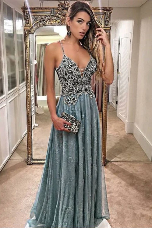 A-Line Spaghetti Straps Floor-Length Lace Formal Prom Dresses with Beading OK918