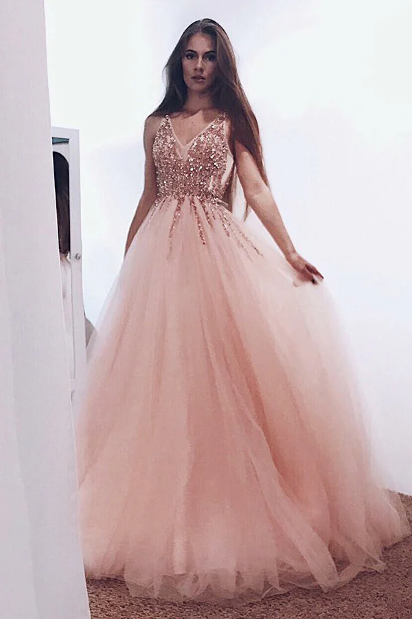 A-Line Pearl Pink Tulle V Neck Long Prom Dresses with Sequins OK972