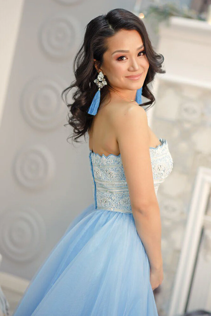 Princess Strapless Sky Blue Long Tulle A Line Prom Dresses with White Lace OK950
