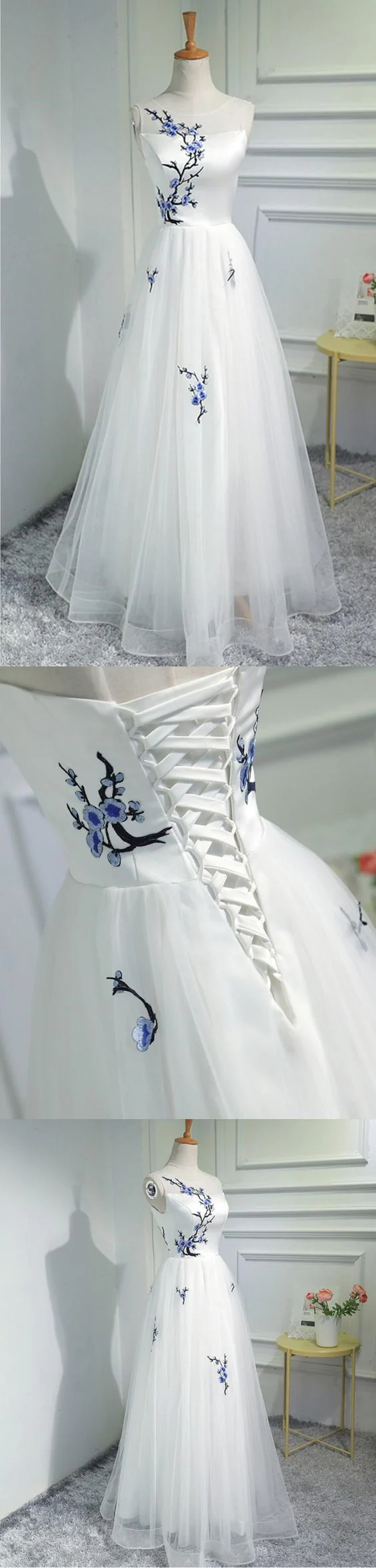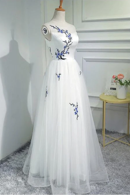 Simple Women Fashion White Embroidery Tulle Long Prom Evening Dress OK945