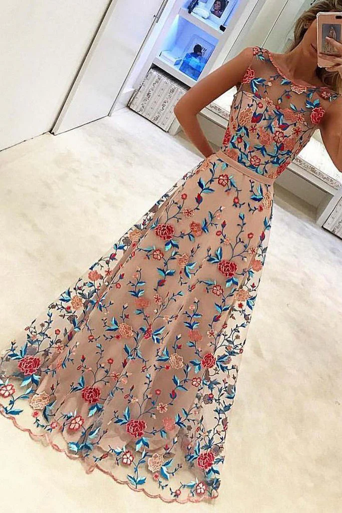 Unique Floral Embroidery Long A Line Prom Dress Evening Dresses OK936
