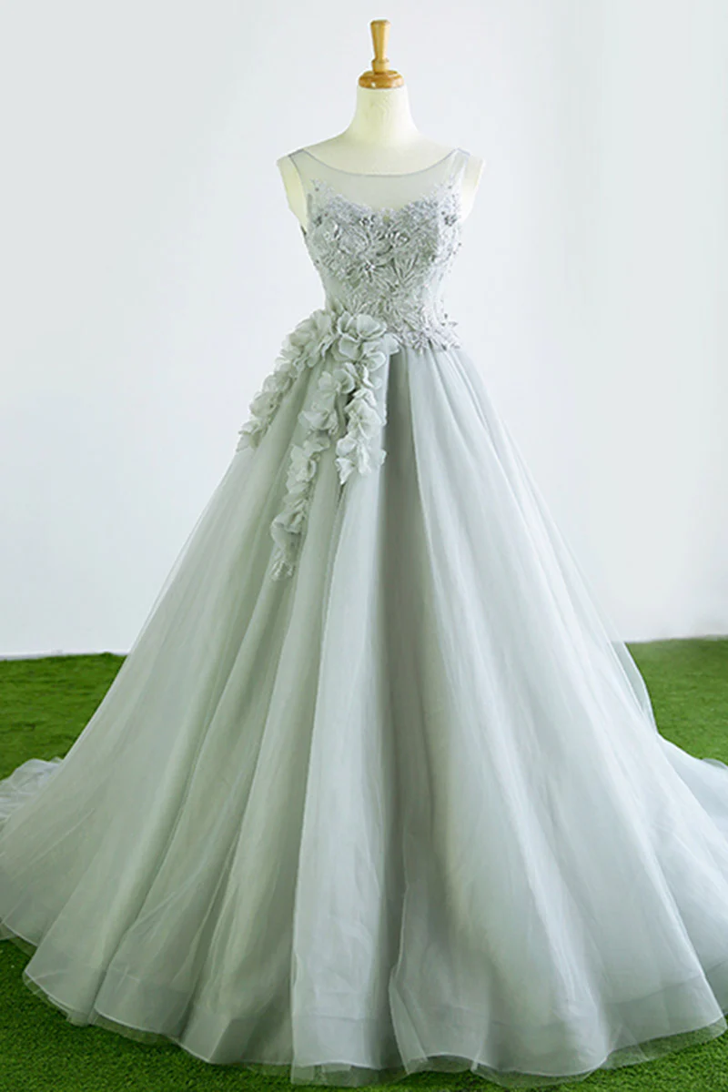 Gray Tulle Court Train Formal Long Prom Dresses With Flowers OK942