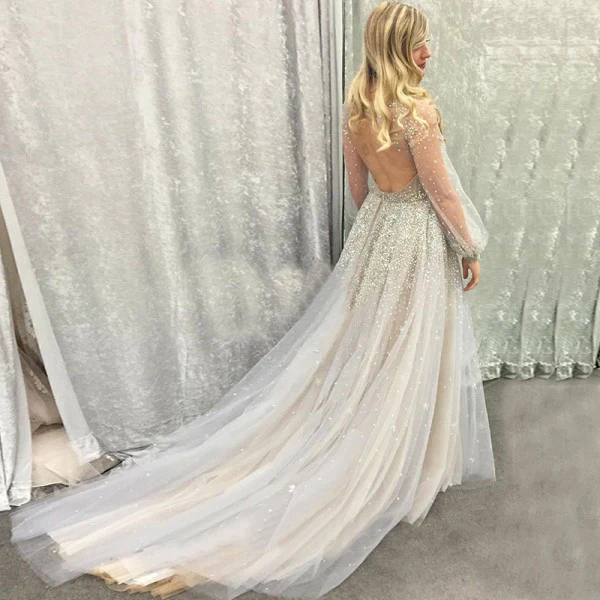 Charming Backless Sequined A Line Long Prom Dress,Cheap Wedding Dresses OK923