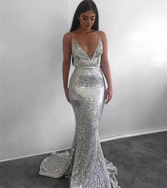Silver Mermaid Sequined Deep V Neck Backless Prom dress OK907