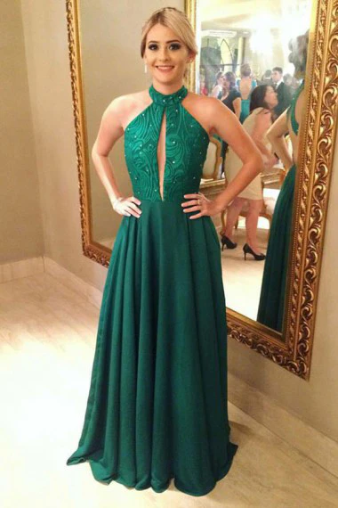 Charming A-Line Jewel Green Keyhole Open Back A Line Prom Dresses with Beading OK961