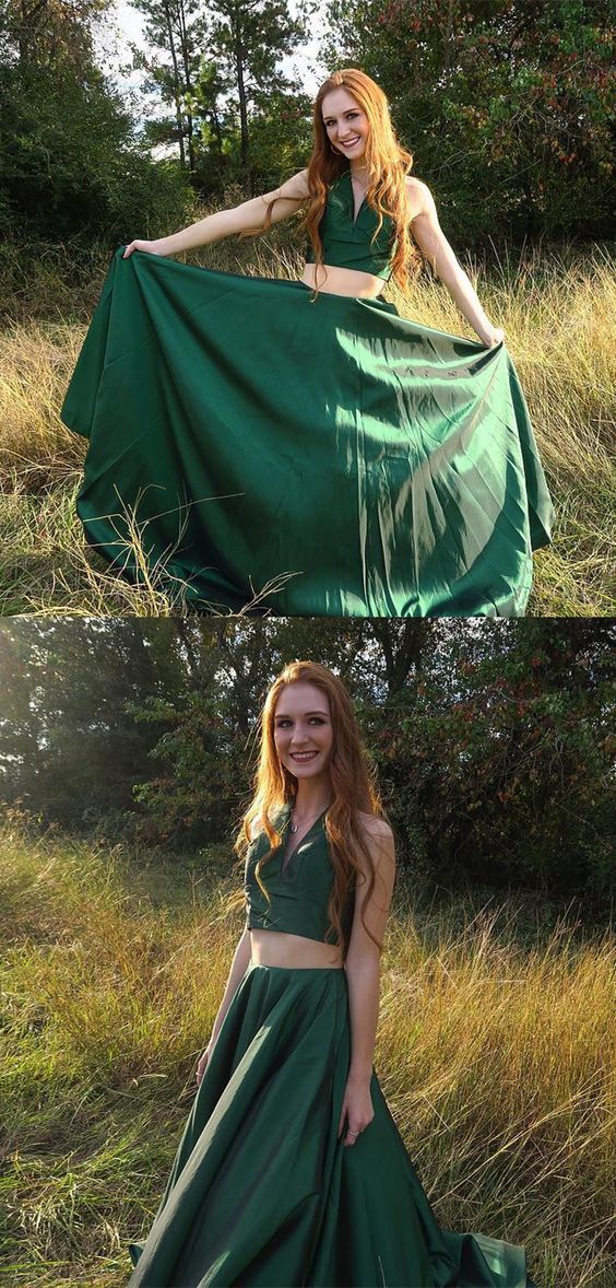 Green Two Pieces A Line Simple Long V Neck Prom Dress OK966