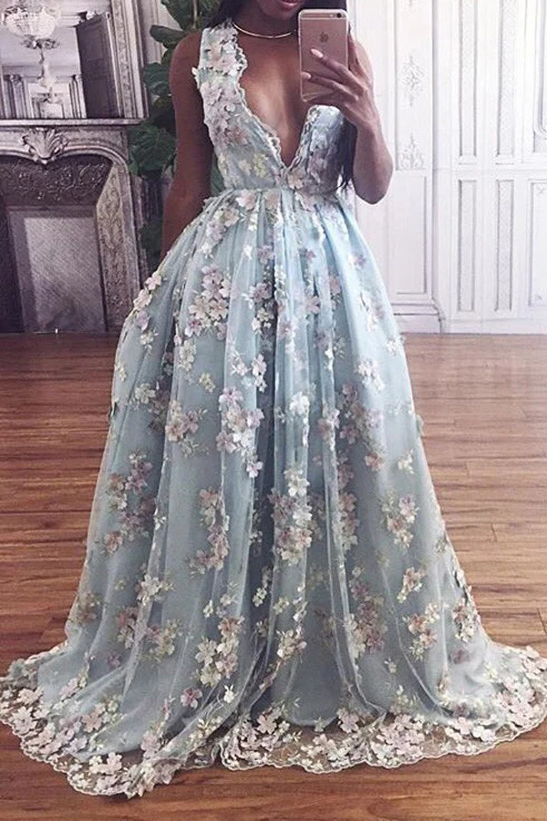 Floral Lace Deep V-neck A Line Light Sky Blue Princess Prom Dresses OKA42
