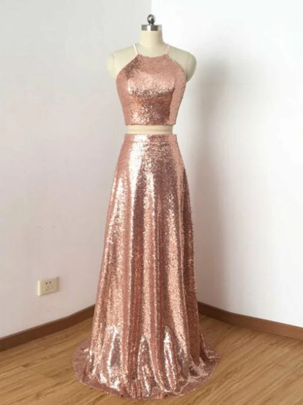 New Arrival Two Piece Sequined Cheap Long A Line Prom Dresses OKA16