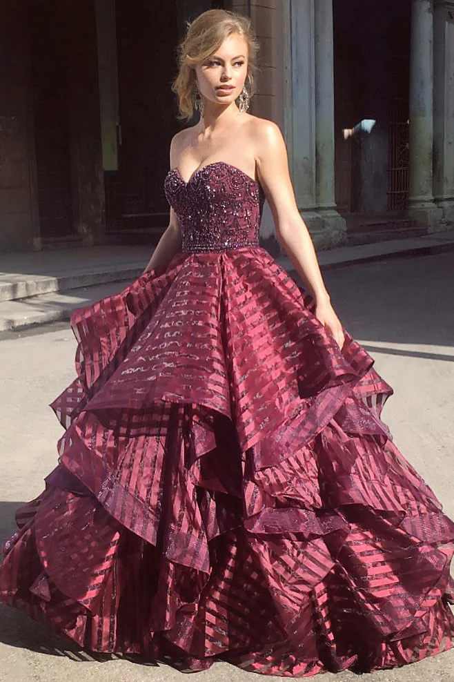 Charming Ball Gown Sweetheart Strapless Burgundy Long Prom Dresses with Beading OKA13