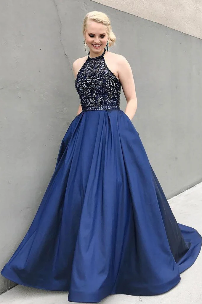Charming Beaded Blue Prom Dresses,Long Evening Dresses With Pockets OK985