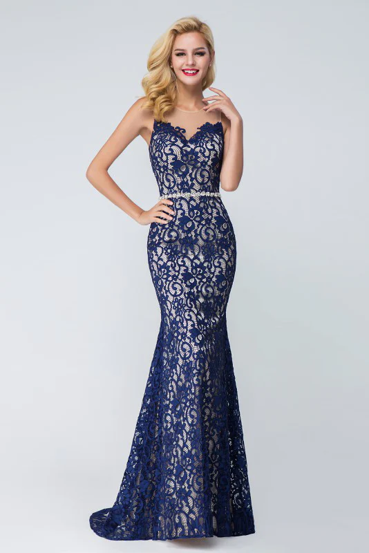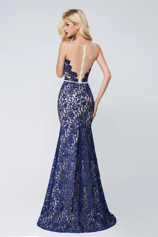 Unique Navy Blue Lace See-through Round Neck Mermaid Floor-length Prom Dresses OK986