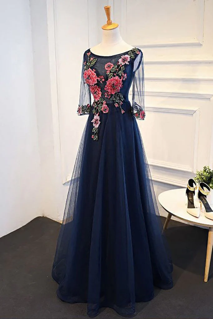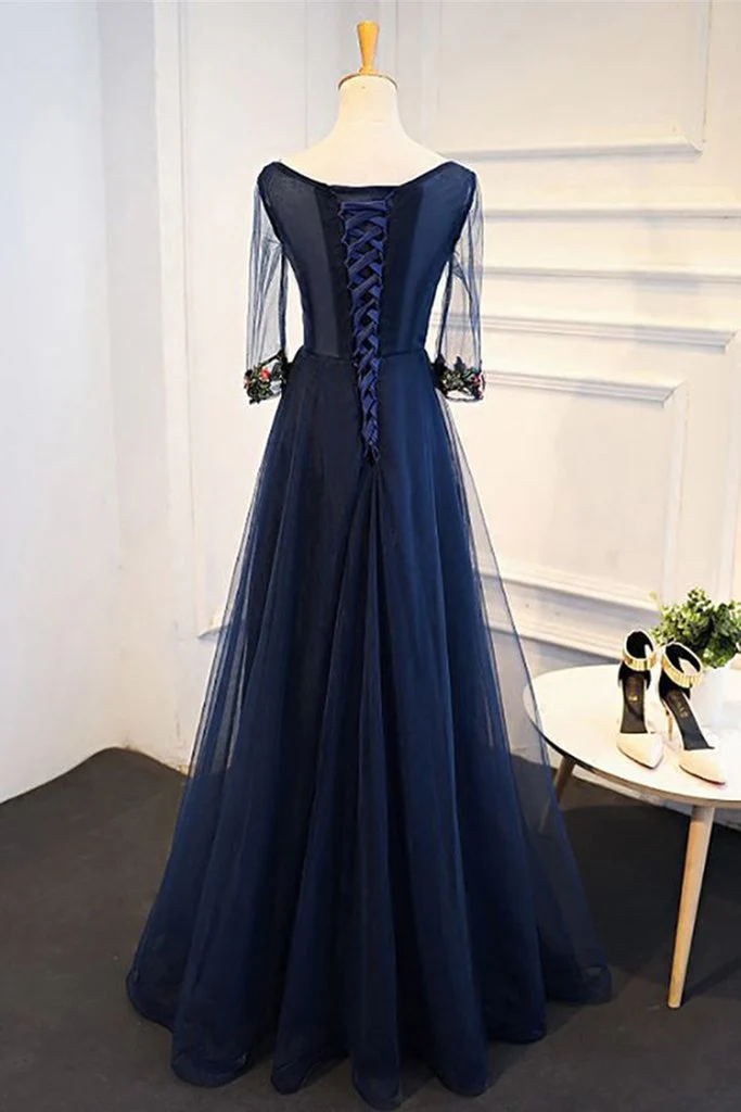 Navy Blue Tulle A-line Flower Appliques Prom Dresses With Sleeves,Long Formal Evening Dress OKA28
