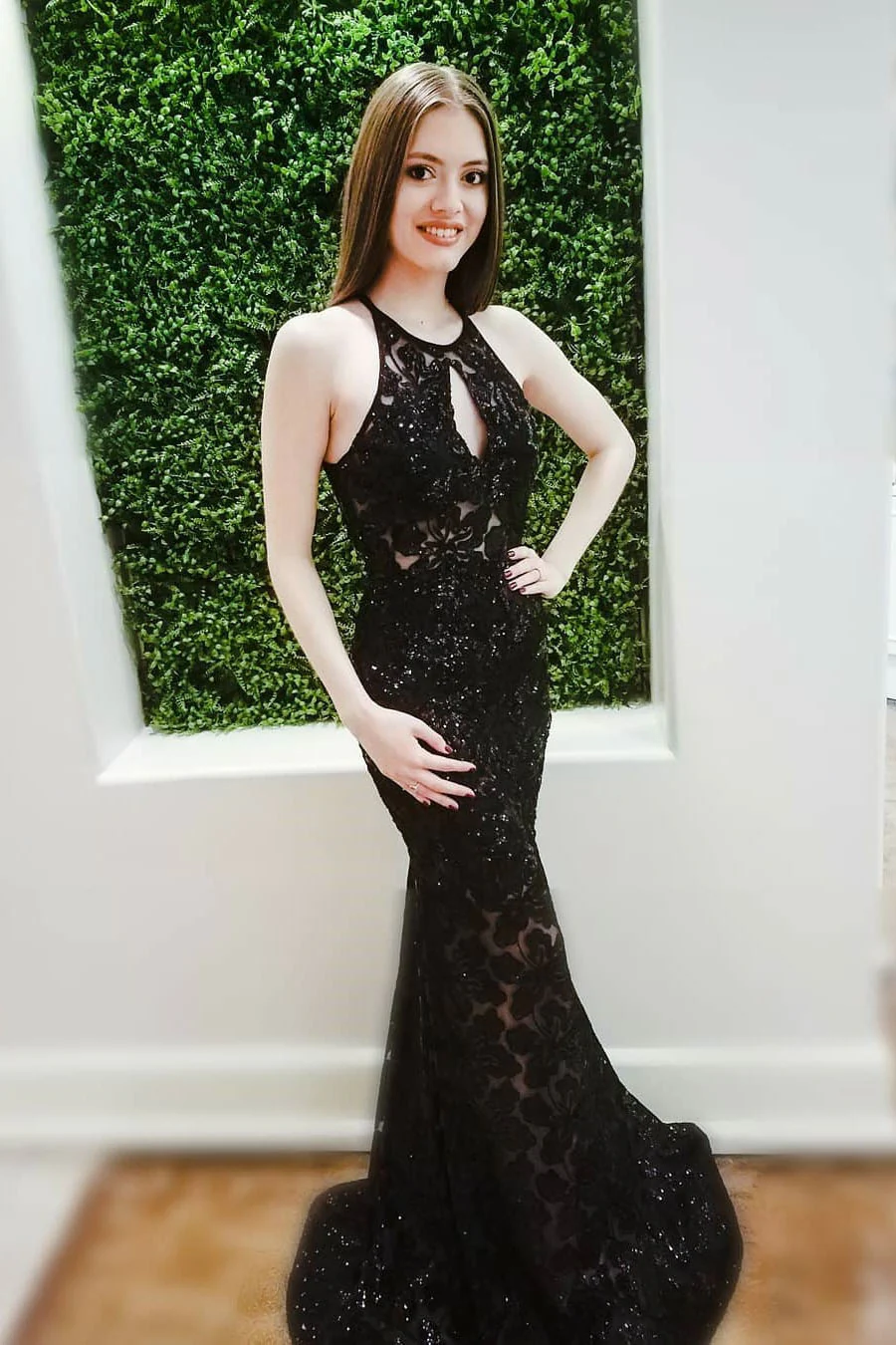Sexy Black Lace Mermaid Long Sleeveless Keyhole Prom Dresses with Open Back OK983