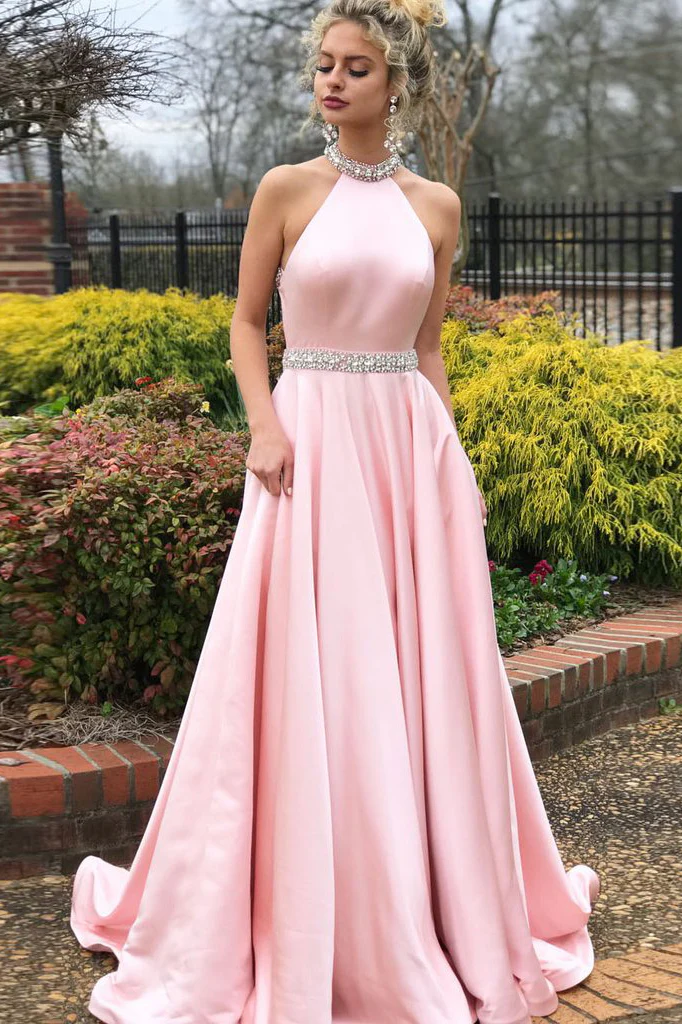 Fashion A-line Pink High Neck Sexy Back Cheap Beading Prom Dresses OKA15