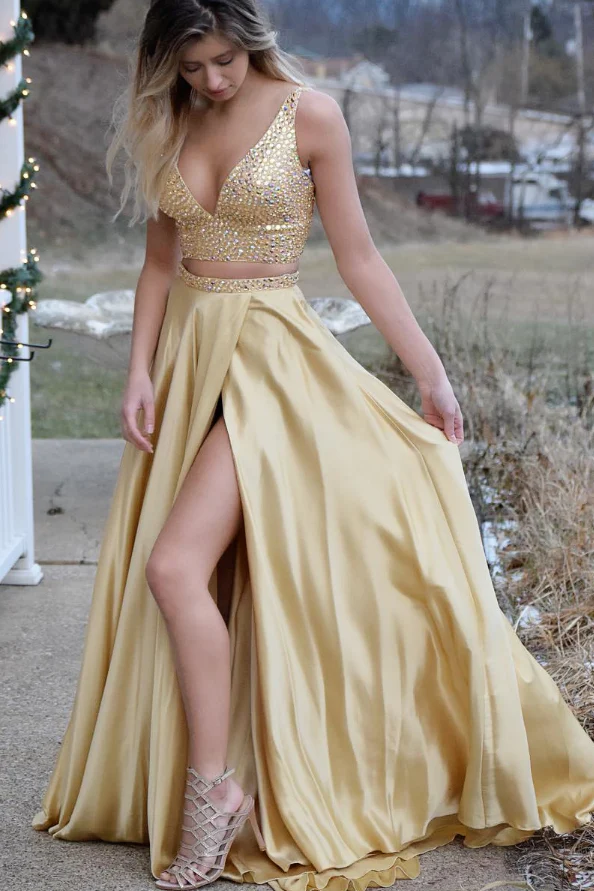Gorgeous Two Piece Gold Long Beading Prom Dresses,Slit Side A Line Evening Dress OKA3