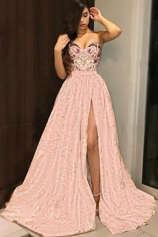 Princess A-Line Sweetheart Pink Long Prom Dresses with Split Appliques OKA37