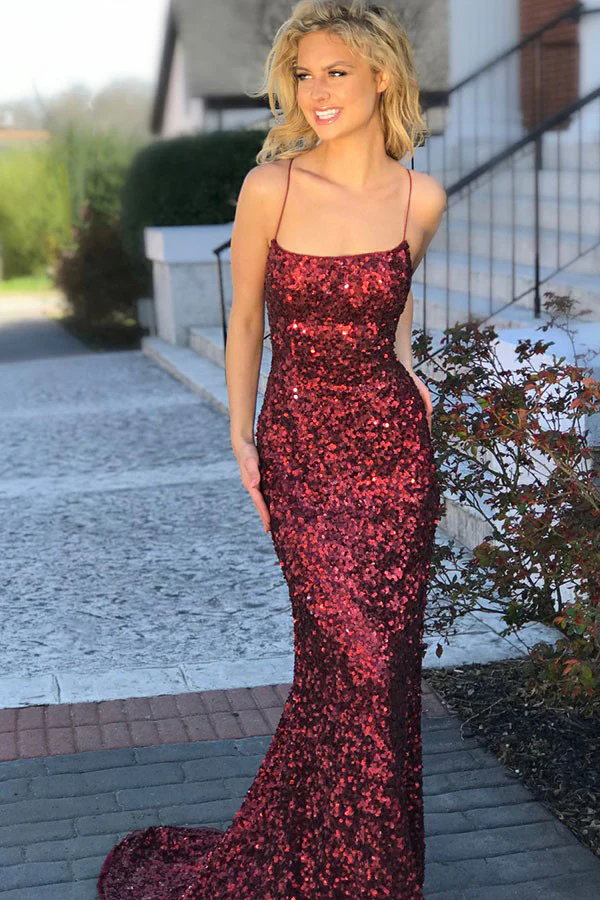 Sexy Sheath Mermaid Spaghetti Straps Criss Cross Burgundy Sequined Prom Dresses OKA30