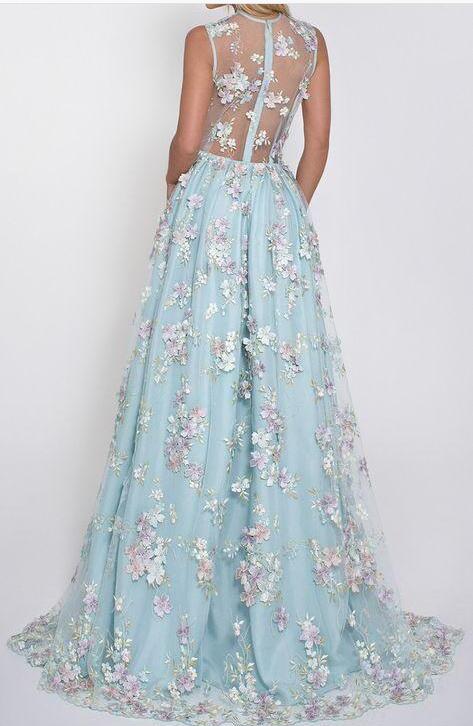 Romantic Tulle V neck Long Evening Dress,Lace Appliques Senior Prom Dresses OK990