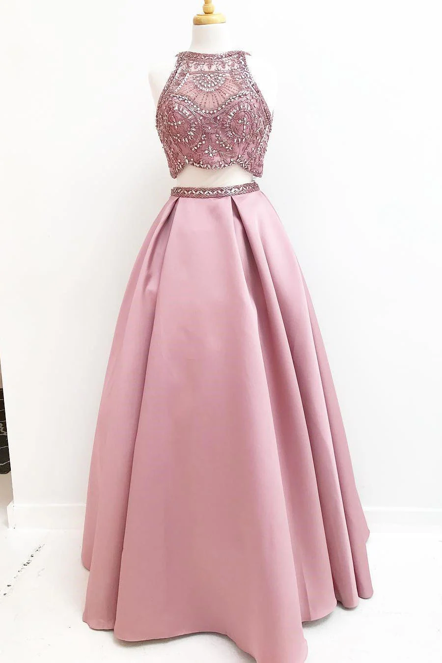 Gorgeous Two Piece Beading Pink Satin A Line Long Prom Dresses OK981