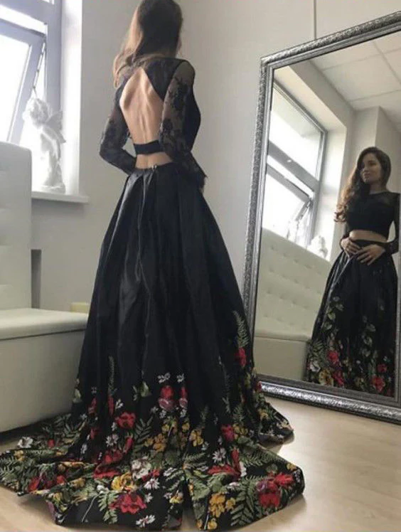 Two Piece Lace Top Floral Black Long Sleeves Satin Prom Dresses with Appliques OKA4