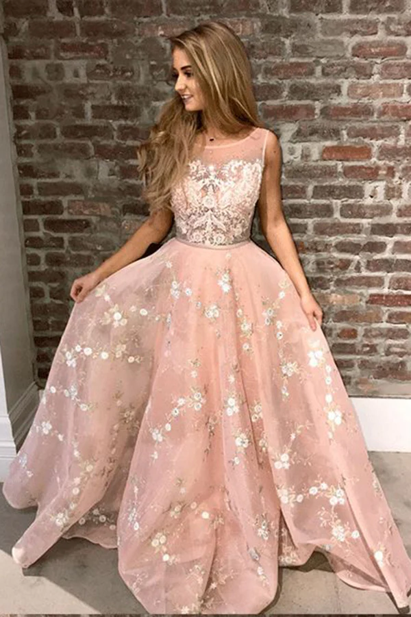 Princess A-Line Sweetheart Blush Pink Tulle Long Prom Dresses with Flowers OKA14
