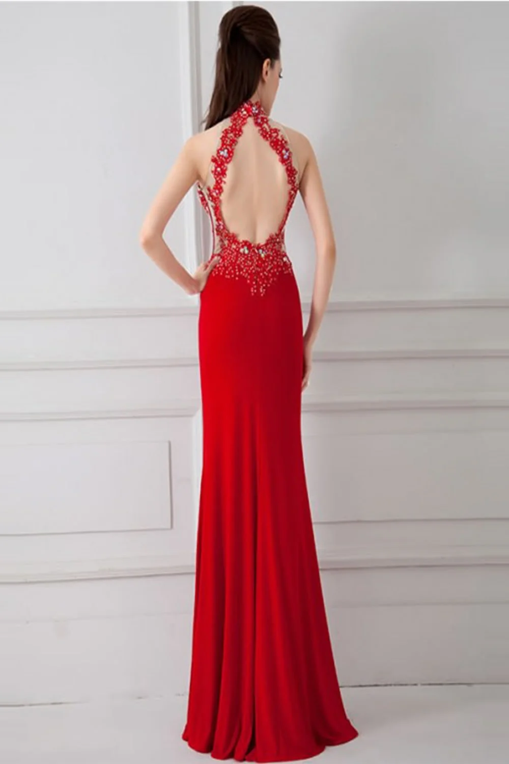 Open Back Red Long Lace Beaded Prom Evening Dress ED0842
