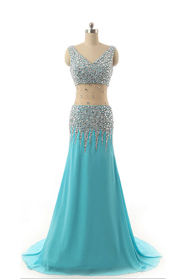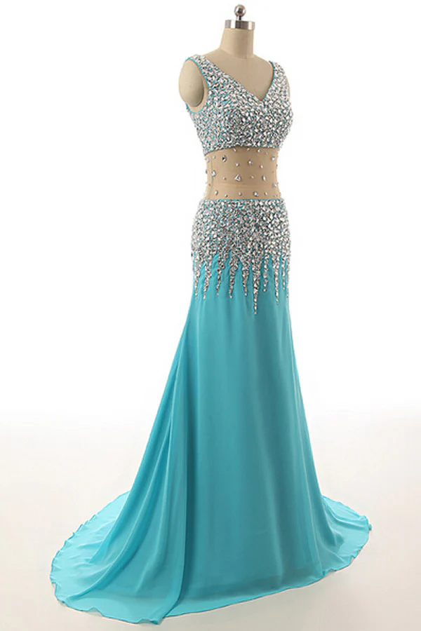 V-neck Light Sky Blue Beaded Long Prom Evening Dress K14