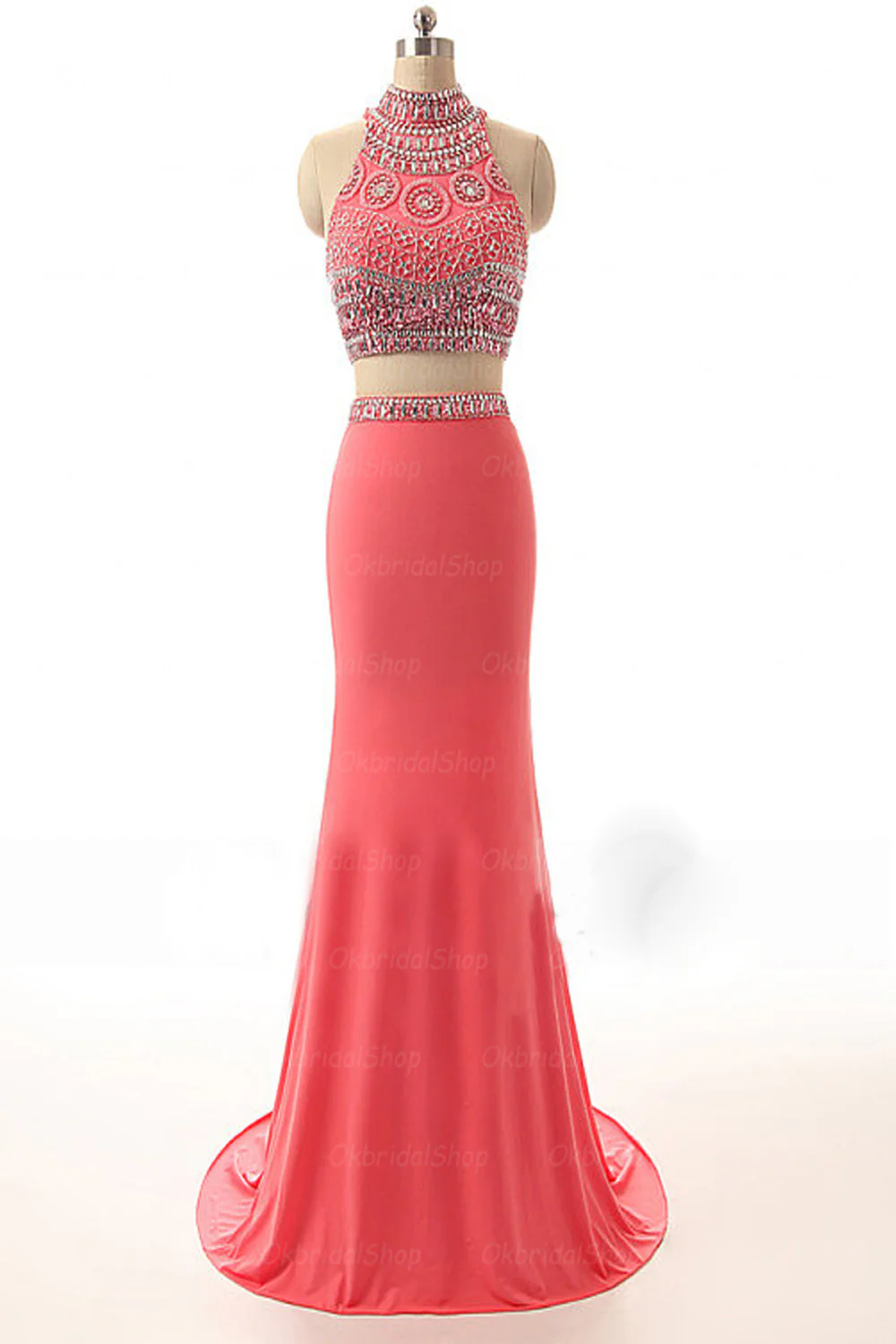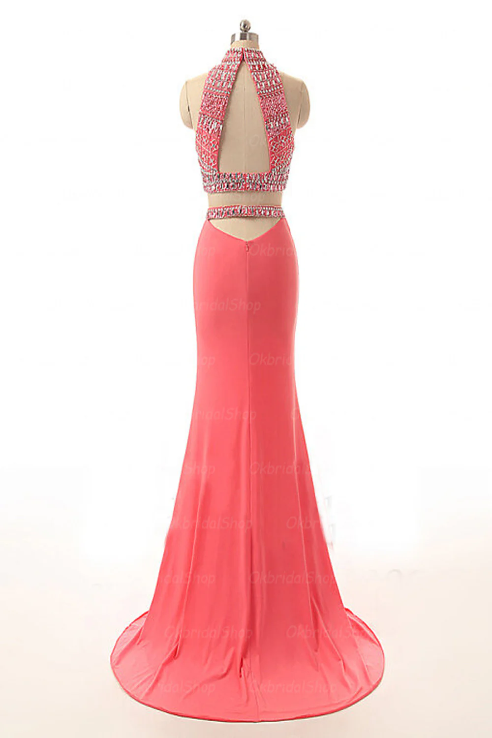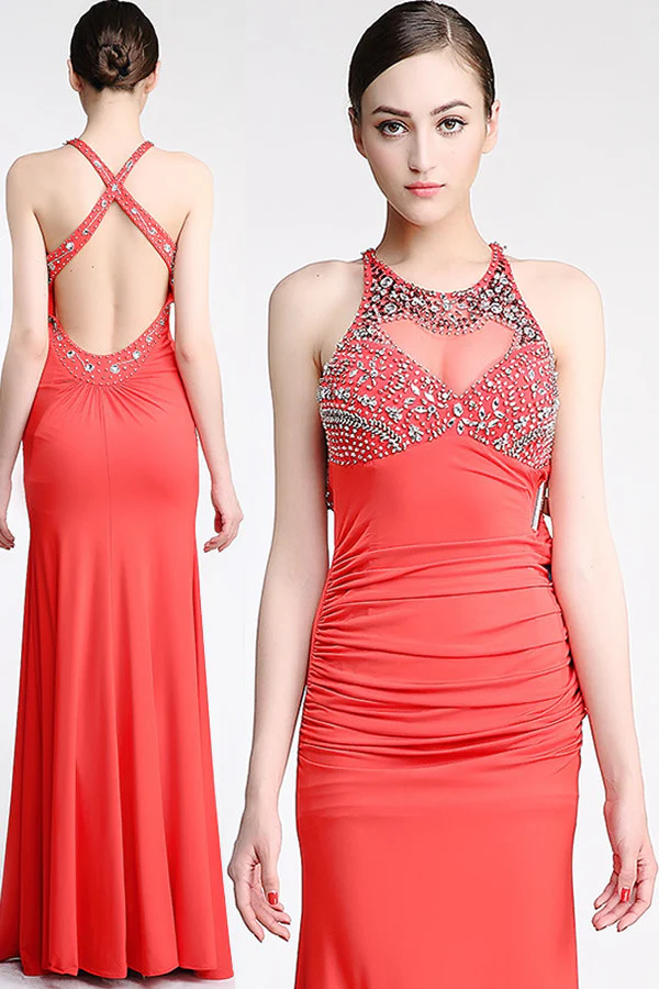 Backless Watermelon Sheath Mermaid Beaded Prom Dress ED0845