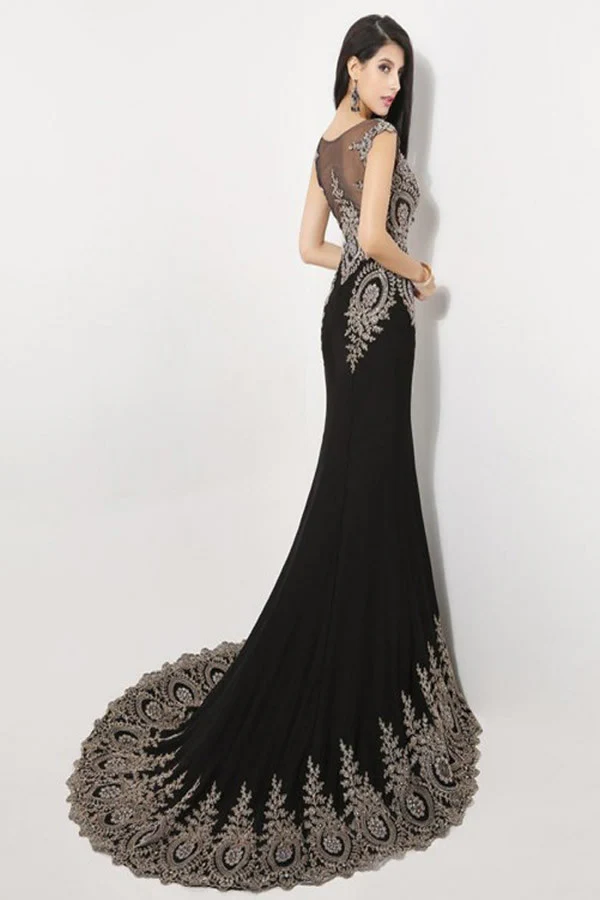 Black Cap Sleeve Beaded Prom Dress with Sweep Train