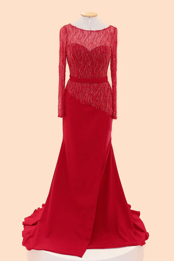 Long Sleeves Red Beaded Cap Sleeves Prom Party Dress ED1033