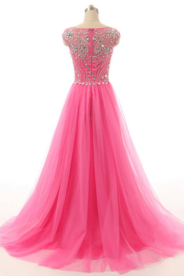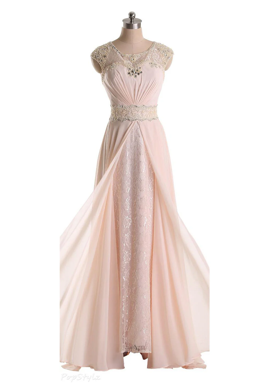 Pink Cap Sleeves Lace Long Beaded Chiffon Prom Dress