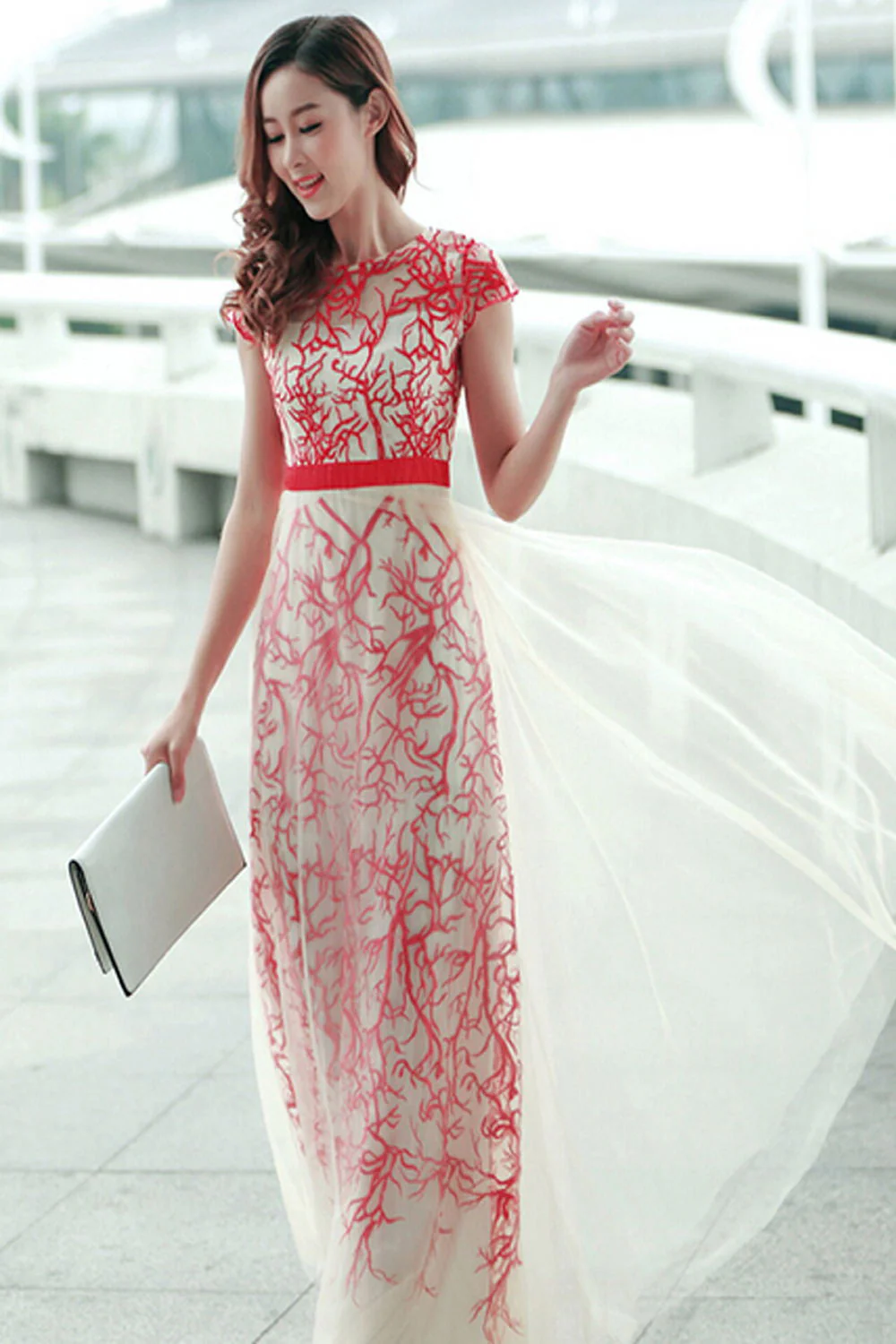 Elegant Watermelon Charming Long Chiffon Lace Prom Dress