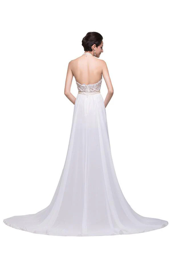 Lace Long Chiffon White Halter Open Back Prom Dress OK7