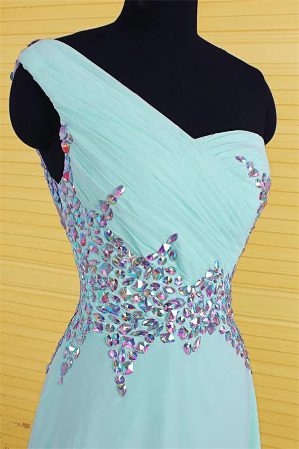 One Shoulder Light Sky Blue Long Beaded Chiffon Prom Dress OK10