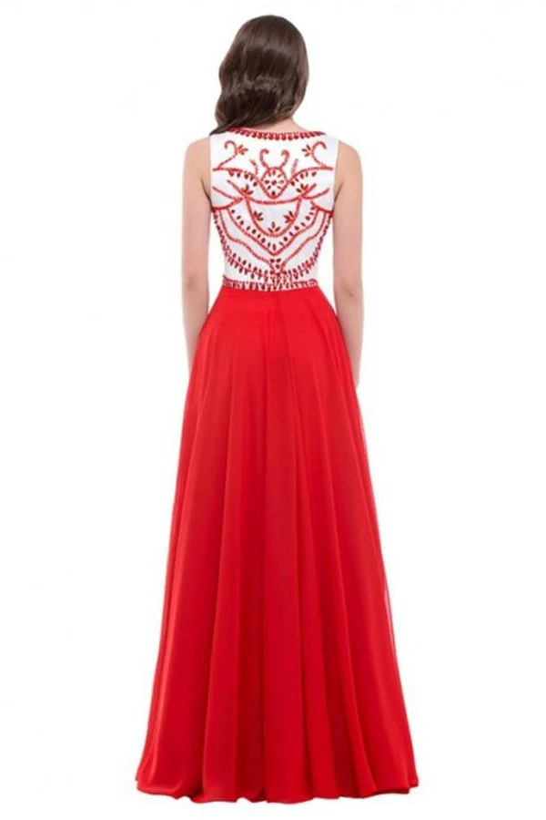 A-line Long Red Beaded Chiffon Prom Dress OK3