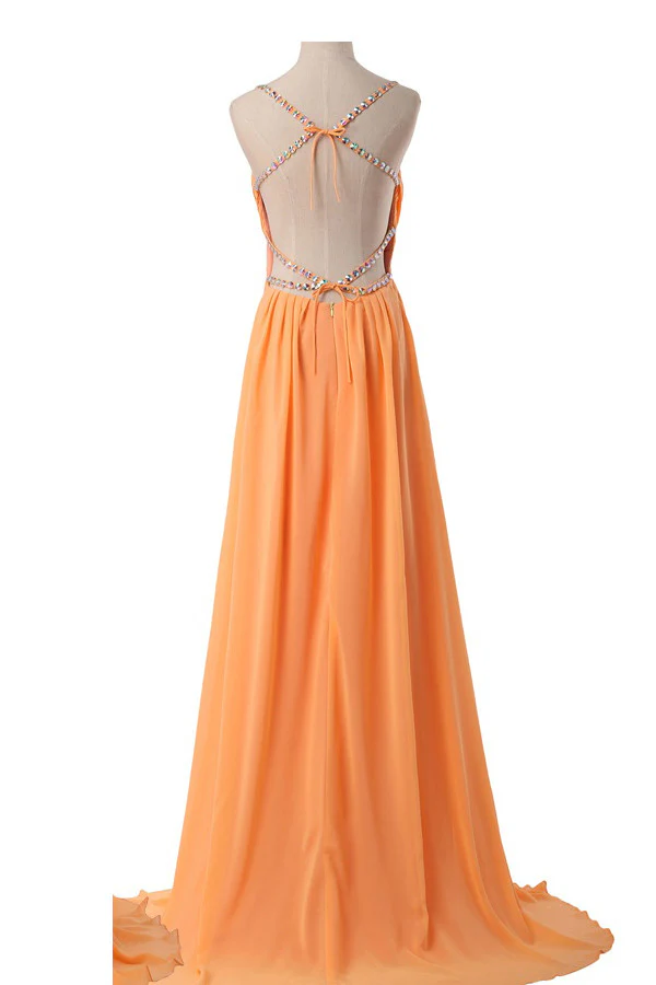 Pretty V-neck Long Chiffon Backless Beaded Prom Dresses K44