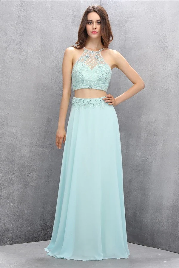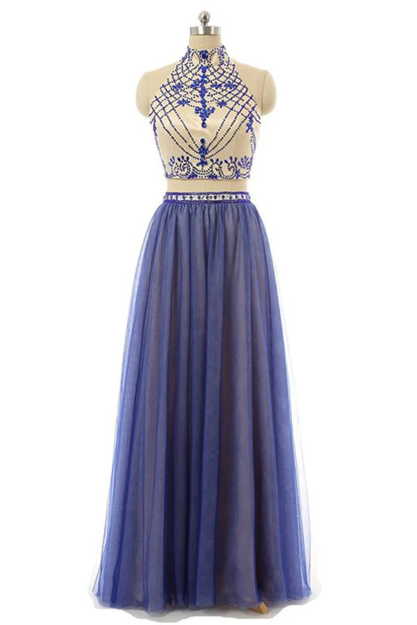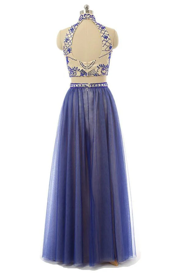 Blue Halter Long Beading 2 Pieces Open Back Prom Dress K104