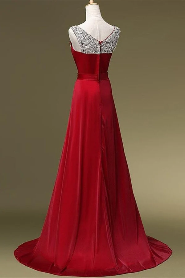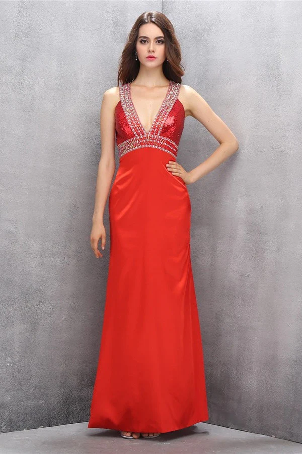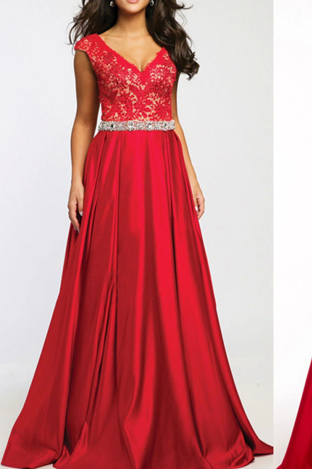 Sexy V-neck Long Satin Lace Red Simple Open Back Prom Dress K94