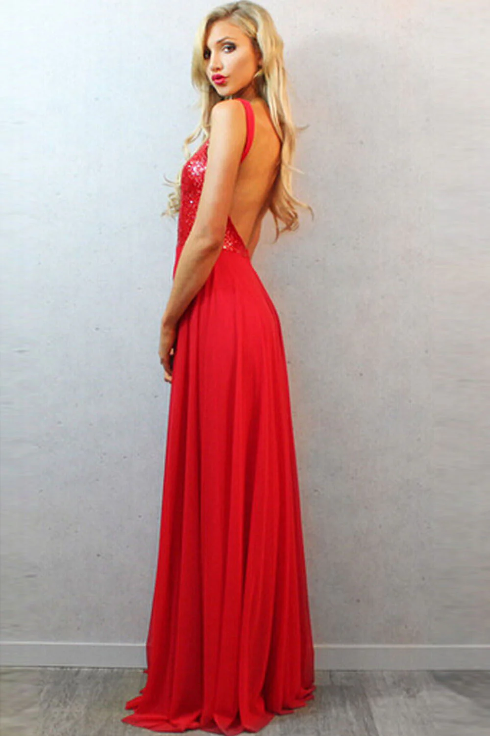 Light Red Long Chiffon Backless Sexy Simple Cheap Prom Dress K93