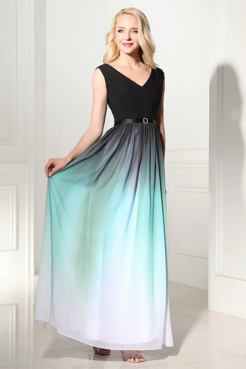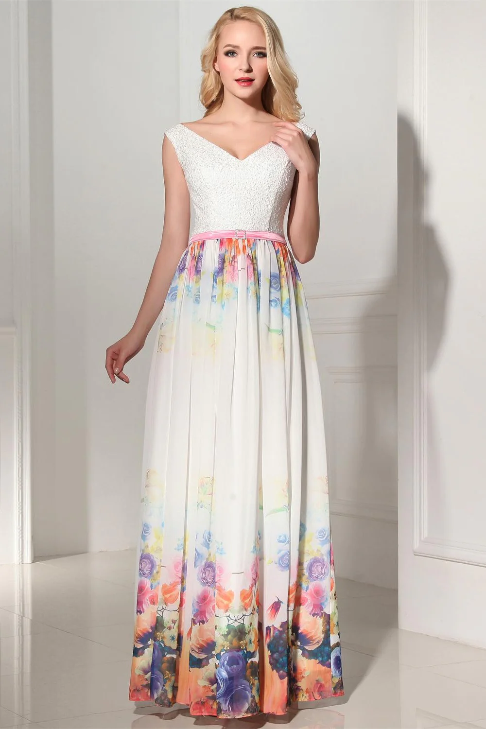 Modest Simple Cheap Printed Long Chiffon V-neck Prom Dresses K121