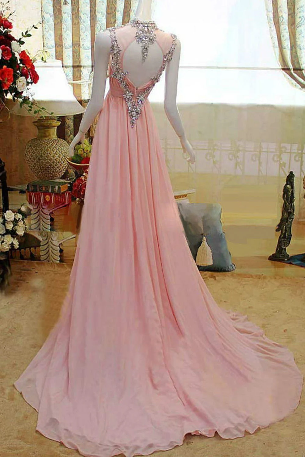 Pink High Low Backless Beading Long Chiffon Prom Dresses K89