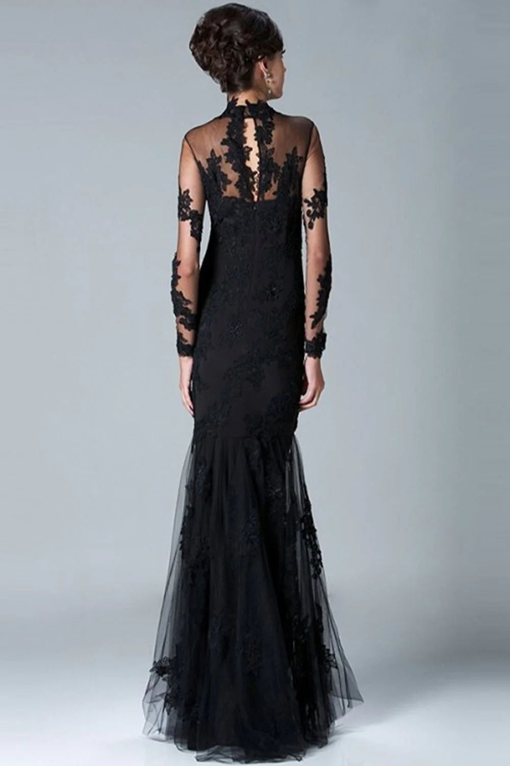 Charming Long Sleeves High Neck Black Lace Mermaid Prom Dress K78