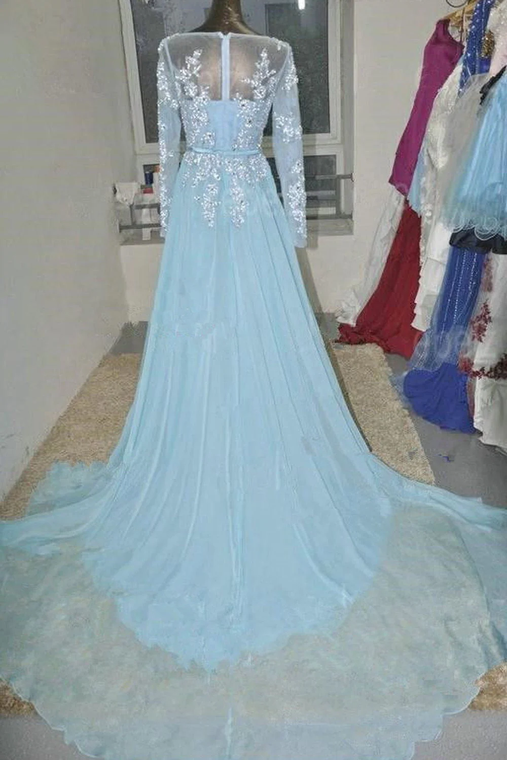 Baby Blue Long Sleeves Lace Beading Chiffon Prom Dress K97