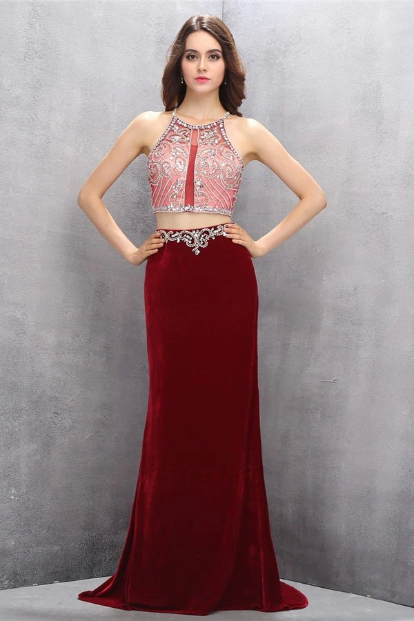 Red Beading 2 Pieces High Neck Long Mermaid Prom Dress K83
