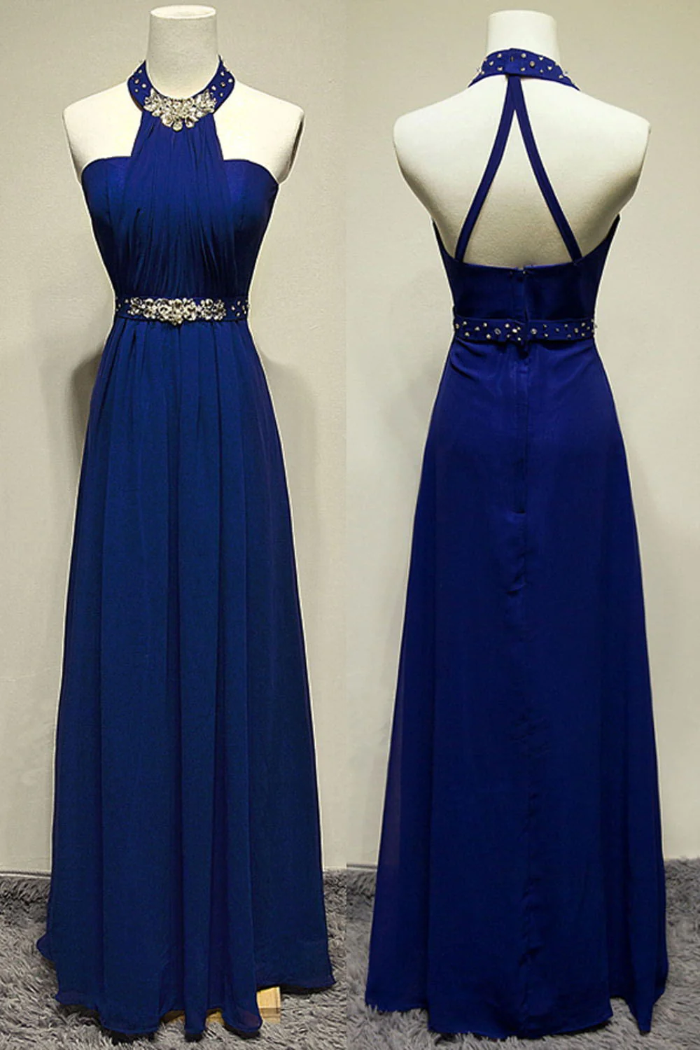 Royal Blue Halter Beading Backless Pretty Long Prom Dress K90
