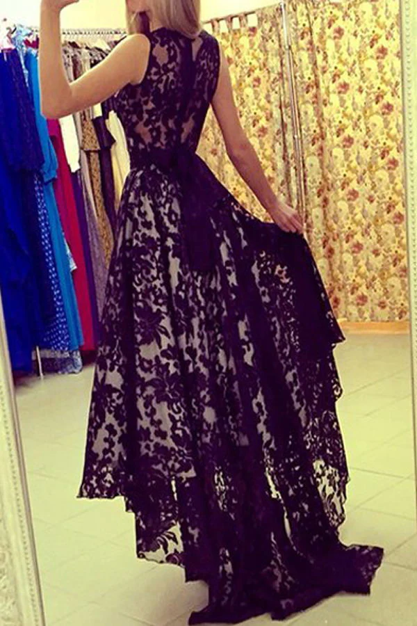 Modest Black Lace Long High Low Charming Prom Dress K80