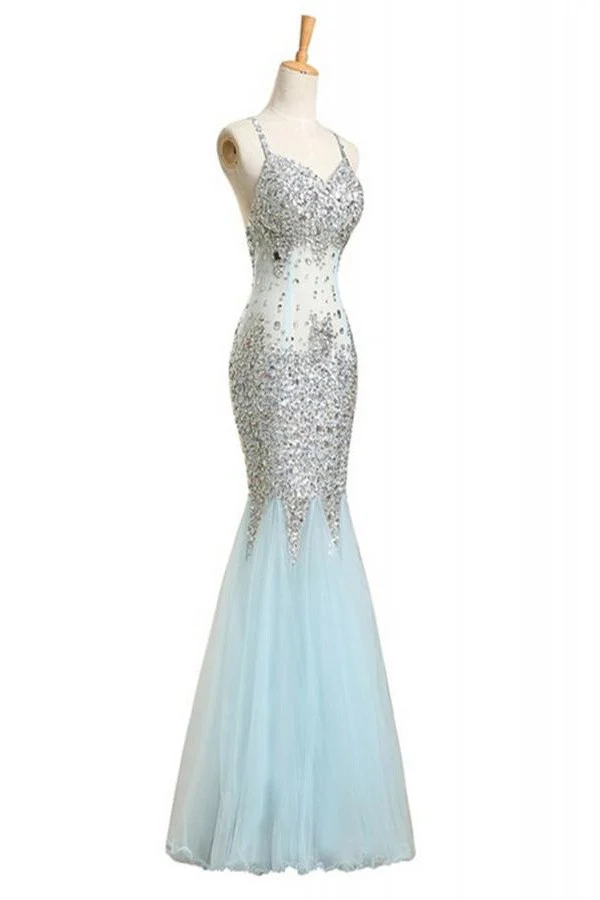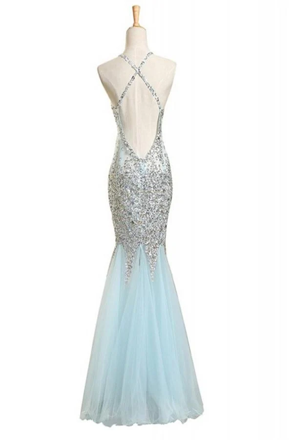 Sequins Shiny Baby Blue Mermaid Long Backless Prom Evening Dresses K111