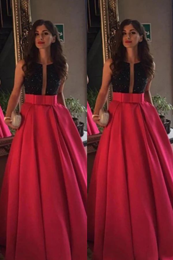Modest Red Beading Long A-line Satin Prom Dresses Evening Dress Party Dresses K665